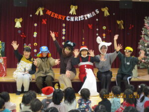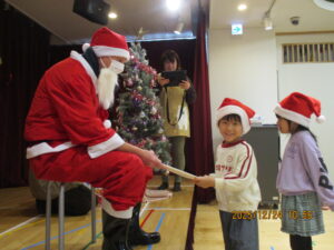 先生たちの劇を見ていたら、鈴の音が聞こえきて、🎅サンタさんが来たんだ!